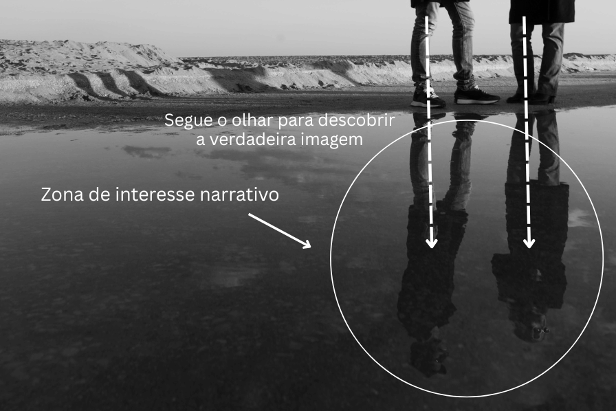 Nesta fotografia, decidi focar-me apenas nas pernas de um casal junto a uma poça de água, deixando deliberadamente os troncos — e os rostos — fora da parte “real” da