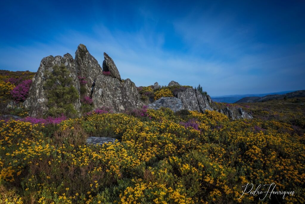 As rochas, pelo seu volume, textura e cor, estabelecem-se como um ponto de fixação do olhar. São maciças, estáticas, e funcionam como âncora estável numa paisagem rica em detalhe floral e variação tonal. Servem de contraponto à leveza da vegetação, criando um equilíbrio entre o estático e o efémero.