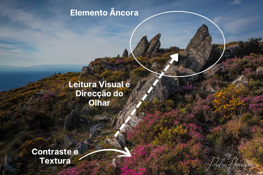 Nesta fotografia realizada pelo Pedro Henriques, o elemento de âncora está claramente definido pelo conjunto de rochas verticais e inclinadas que se destacam no plano médio da composição, à direita. A sua forma aguda, quase triangular, confere-lhes presença visual imediata — são as primeiras estruturas a captar o olhar e, mais importante ainda, orientam a leitura da imagem.