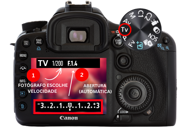 No modo prioridade à velocidade(Tv/S), tu escolhes a velocidade do obturador. O fotómetro mede a luz e a câmara ajusta automaticamente a abertura para chegar à exposição de referência.